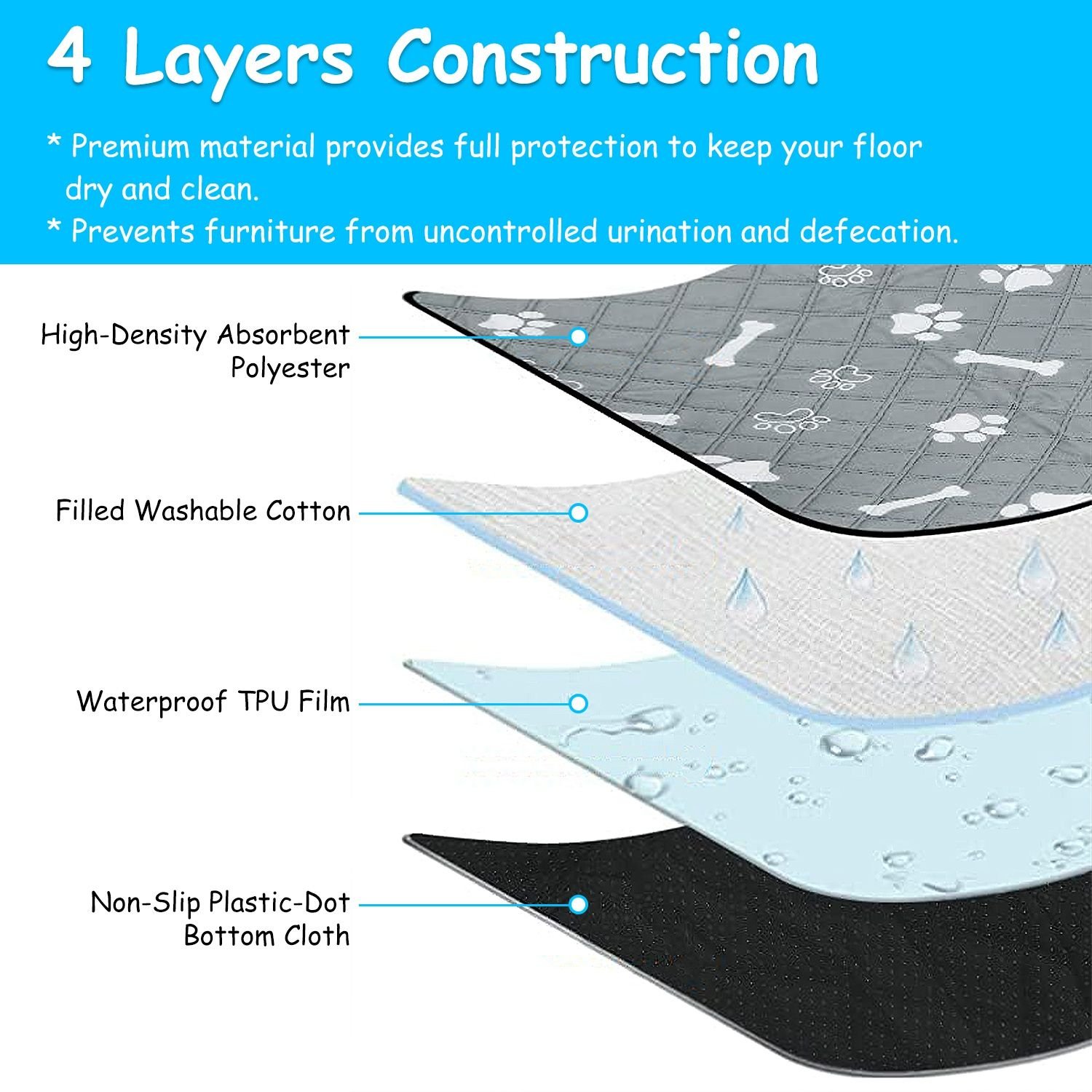*Great Absorption Performance*:Constructed with high-density absorbent polyester,filled washable cotton,waterproof TPU film and plastic-dot bottom cloth,our 4-layer pet mats not only provide your dog soft and comfortable feelings,but also quickly absorb and hold the liquid all day long without any leakage.